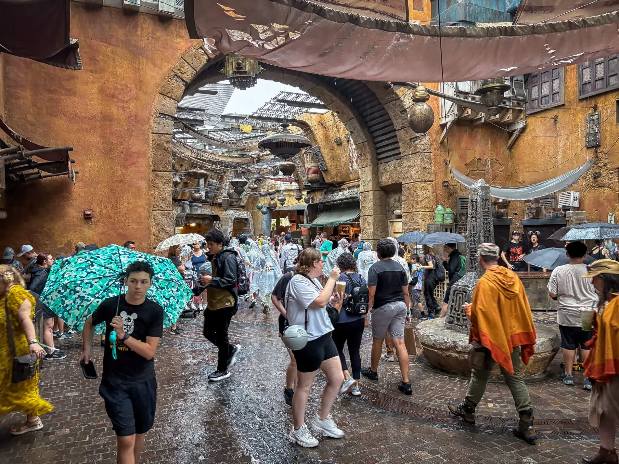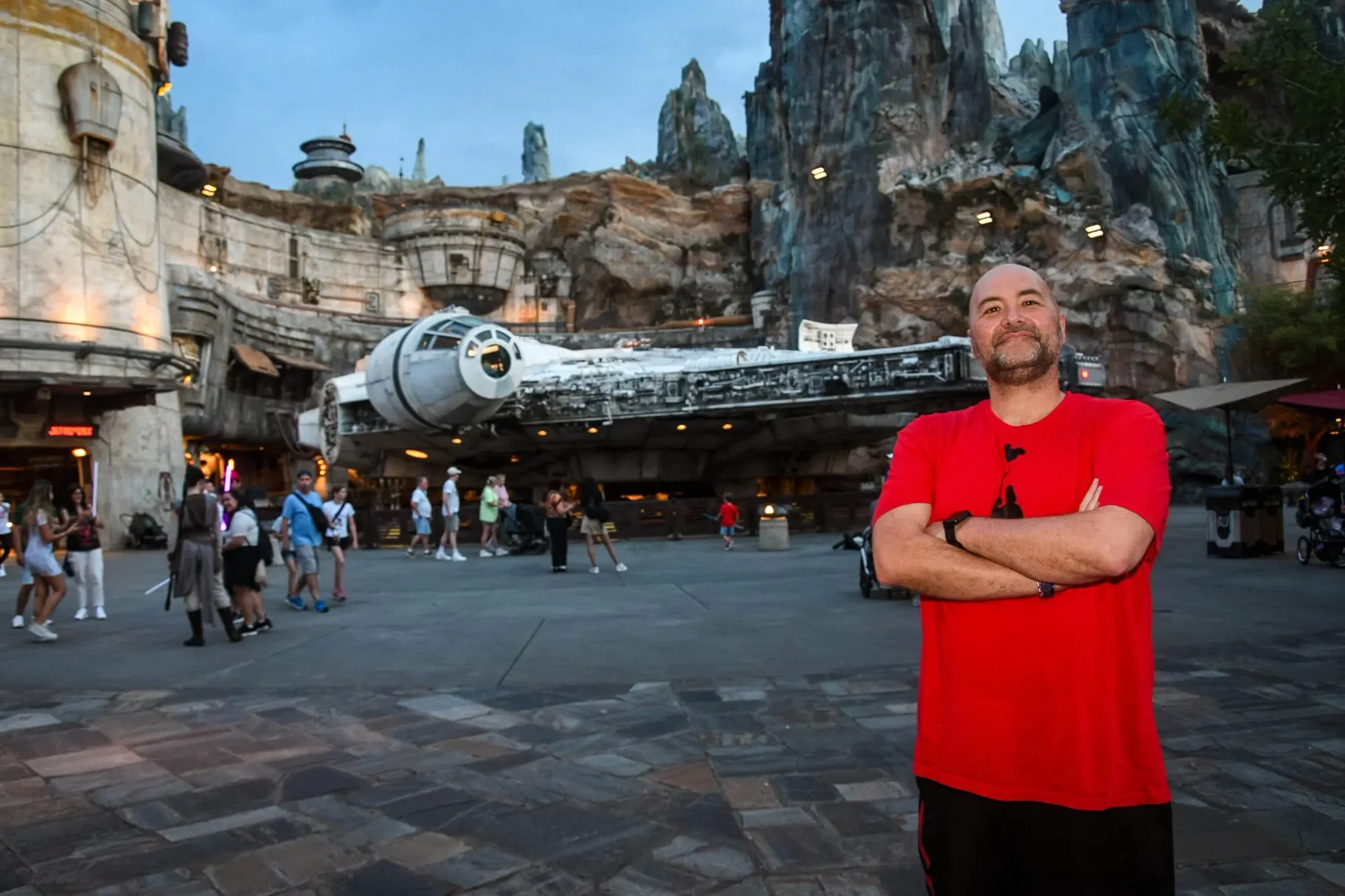 We walked into Galaxy’s Edge through a tunnel, and… BAM. You’re not at Disney. You’re on Batuu. The Millennium Falcon was there, life-sized and majestic. I teared up. Ellena insists I cried. Same difference.